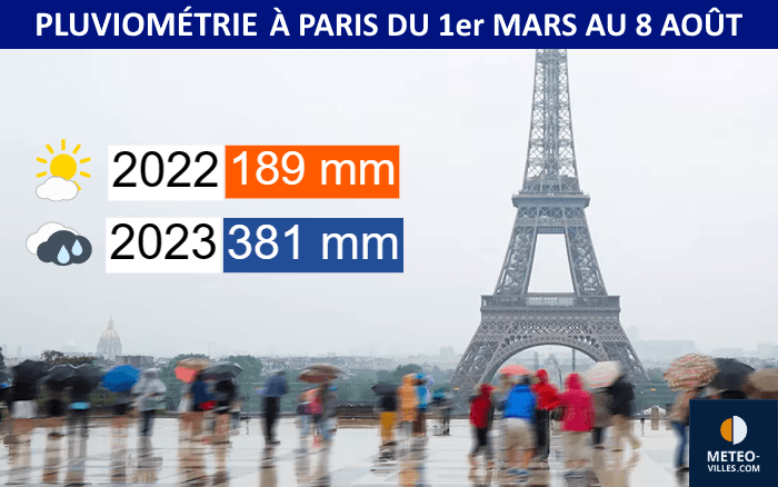 Pluviométrie à Paris du 1er mars au 8 août en 2022 et en 2023 - Météo Villes