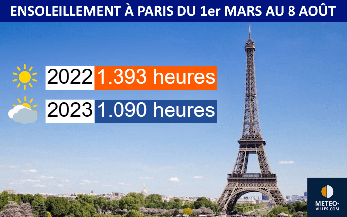 Ensoleillement à Paris du 1er mars au 8 août en 2022 et en 2023 - Météo Villes