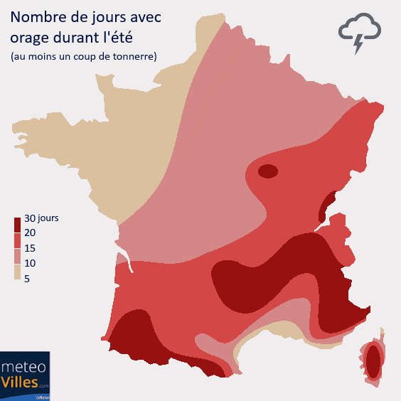 Nombre moyen de jours d'orage (au moins un coup de tonnerre) en France en été - Météo Villes