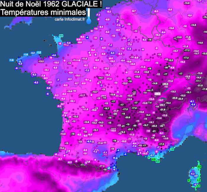 Températures minimales de la matinée du 25 décembre 1962 - carte Infoclimat.fr