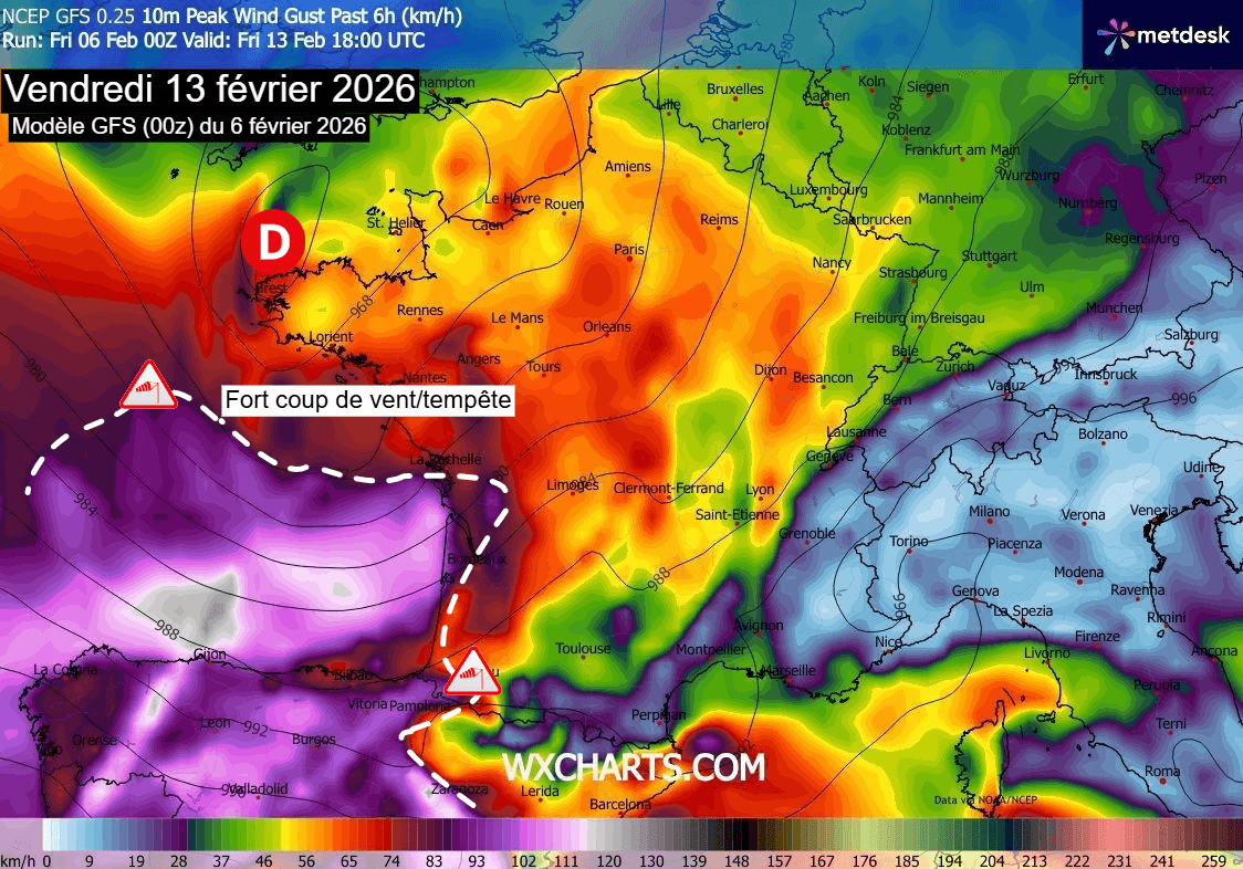 Risque de coup de vent/tempête sur la France en fin de semaine du 9 au 15 février 2026 – Exemple du modèle GFS via WX CHARTS