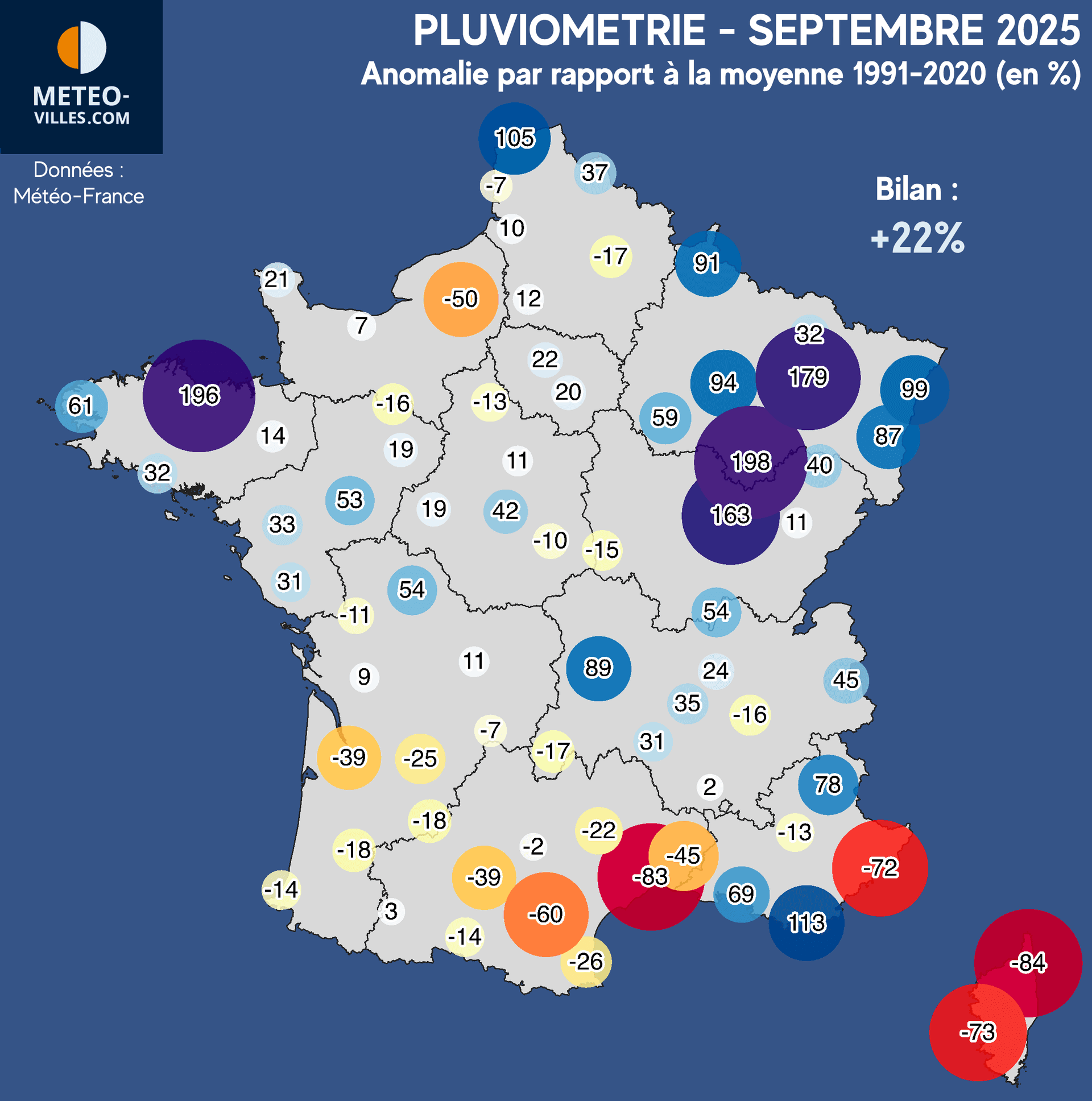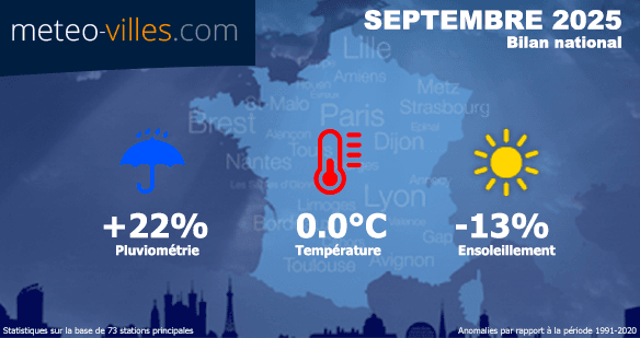 Comme à chaque début de mois, nous vous proposons un nouveau bilan climatologique. Place désormais au bilan cartographié de SEPTEMBRE 2025 en termes de température, pluviométrie et ensoleillement sur un panel de 73 stations*. Les anomalies présentées sont calculées à partir des moyennes climatiques de la période de référence 1991-2020 sur l'ensemble des stations du panel.