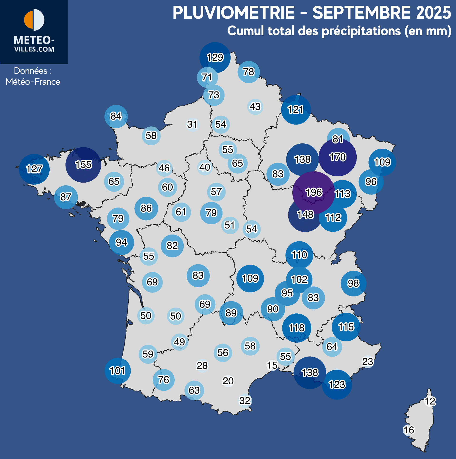 De ce fait, les régions cités précédemment trustent le haut du panier avec des excédents pluviométriques souvent supérieurs à +100% (soit deux fois le cumul mensuel habituel). C'est le cas pour Calais (+105%), Toulon (+113%), +179% à Nancy, +196% à St-Brieuc ou encore +198% à Langres. Quelques villes du réseau secondaire dépassent même les +200% dans le Nord-Est, avec un maximum de +248% à Neuilly-l'Evêque (Haute-Marne).