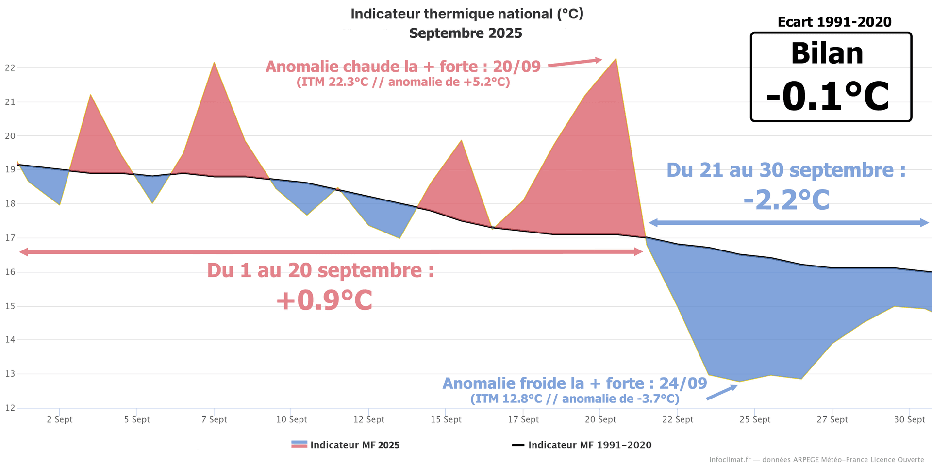 C'est un fait assez rare pour être signalé... mais les températures sur l'ensemble de ce mois de septembre sont conformes aux moyennes de saison ! En effet, avec un indicateur thermique national d'environ 17.5°C, nous nous situons dans les normes de la période 1991-2020. Nous restions sur 11 mois consécutifs en excédent thermique, le dernier mois en-deça des moyennes remontant à septembre 2024 (-0.3°C). Un second mois consécutif de septembre sans excédent de température... bien loin de septembre 2023 qui reste le plus chaud observé en France (+3.6°C).