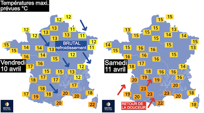 Températures maximales prévues entre vendredi 10 et le samedi 11 avril. Bulletin Meteo-villes.com
