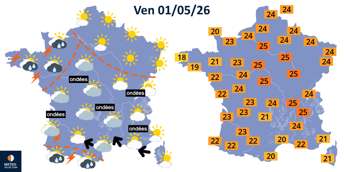Temps et températures maximales prévus le vendredi 1er mai 2026 - Météo Villes