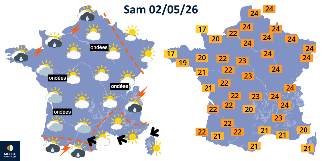 Temps et températures maximales prévus le samedi 2 mai 2026 - Météo Villes