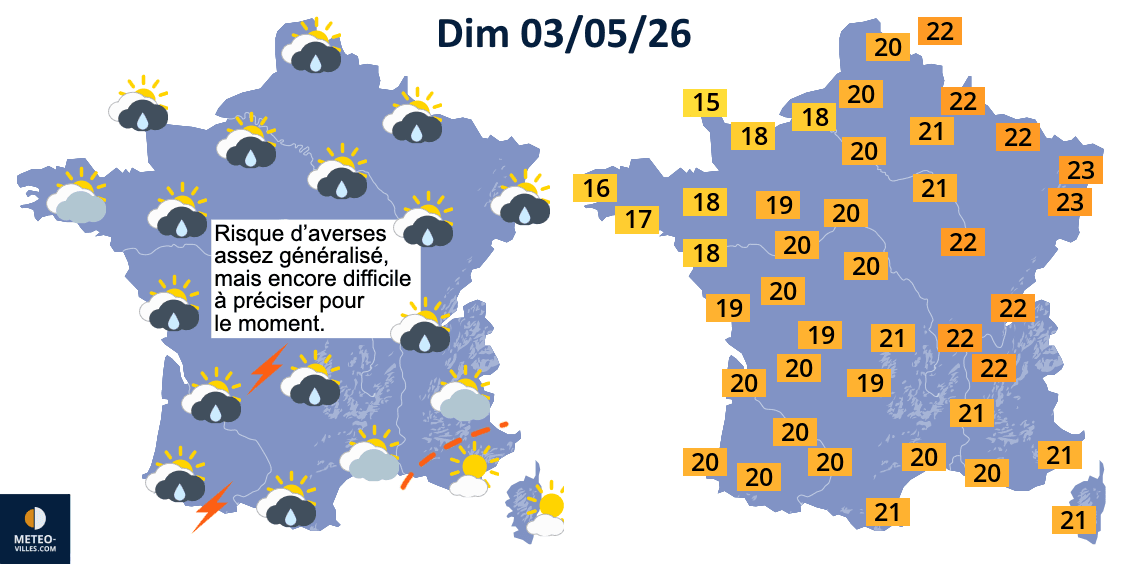 Temps et températures maximales prévus le dimanche 3 mai 2026 - Météo Villes