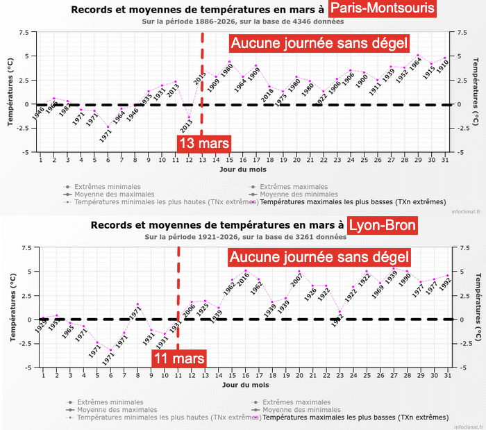 Cette tendance est d'ailleurs bien visible en regardant l'évolution des records de températures maximales minimales à Paris et Lyon au fil du mois de mars. Si ces deux villes représentatives ont déjà connu des journées sans dégel durant la première quinzaine du mois, cela n'a jamais été le cas après le 15 mars depuis le début des relevés.