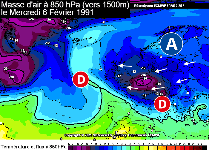 Masse d'air à 850 hPa (vers 1500m) le mercredi 6 février 1991 - meteociel.fr