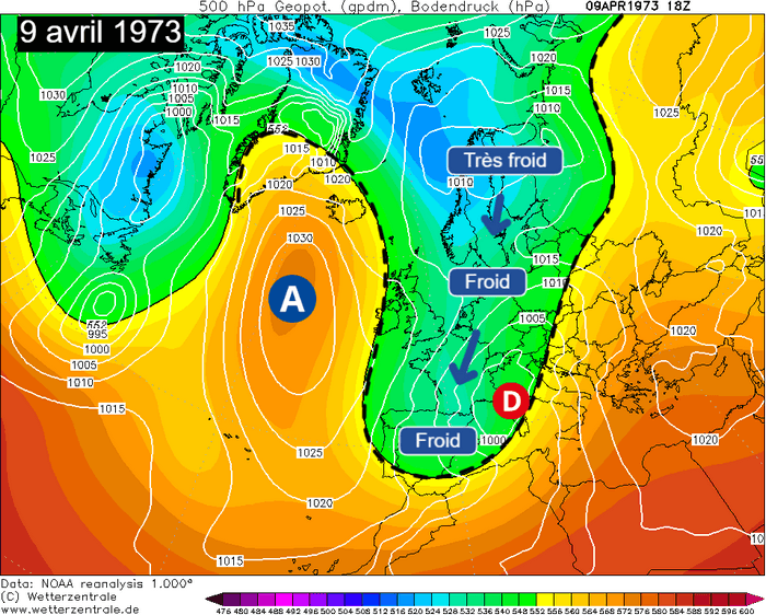 Situation du 9 avril 1973 sur l'Europe – Via Wetterzentrale