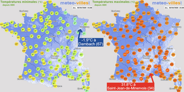 Ces écarts journaliers très importants de températures peuvent également être très importants entre différentes régions. En gardant l'exemple de ce jeudi 9 avril, la température minimale en plaine fut de -1,9°C à Dambach (67) alors que la température maximale du jour a atteint 31,8°C à Saint-Jean-de-Minervois (34), soit une amplitude thermique de 33,7°C !