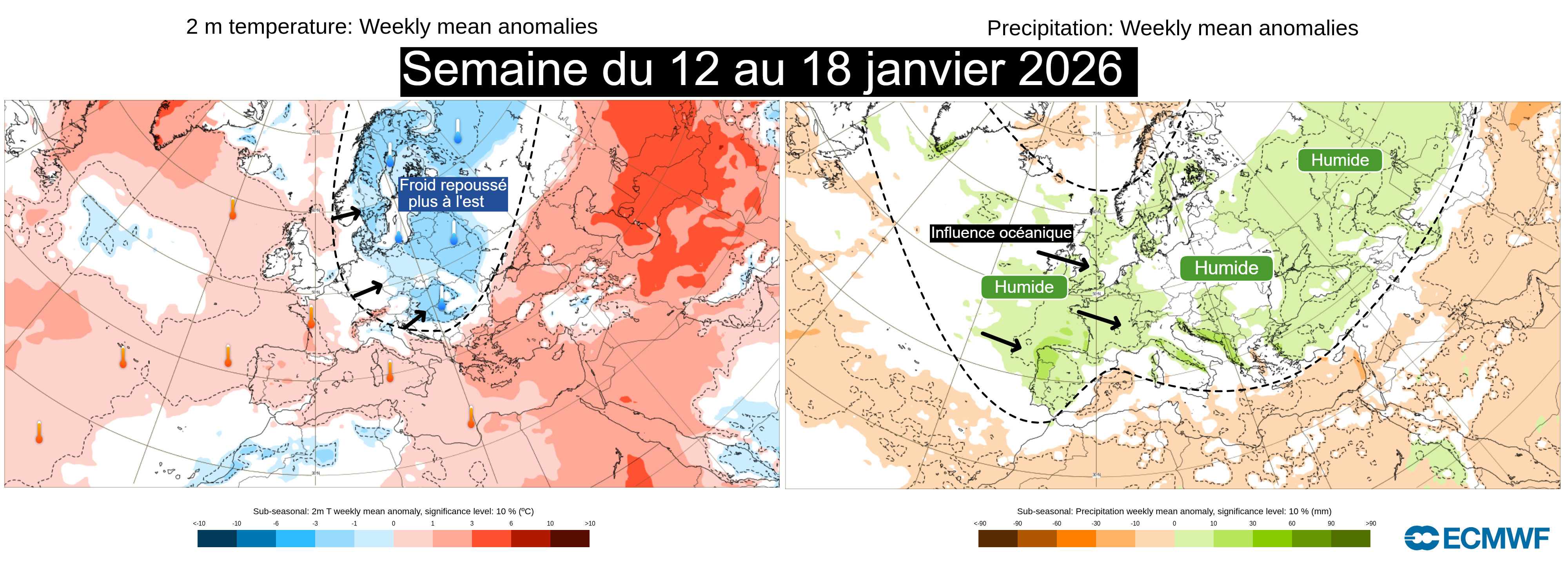 Anomalies de températures et de précipitations pour la semaine du 12 au 18 janvier 2025 – ECMWF