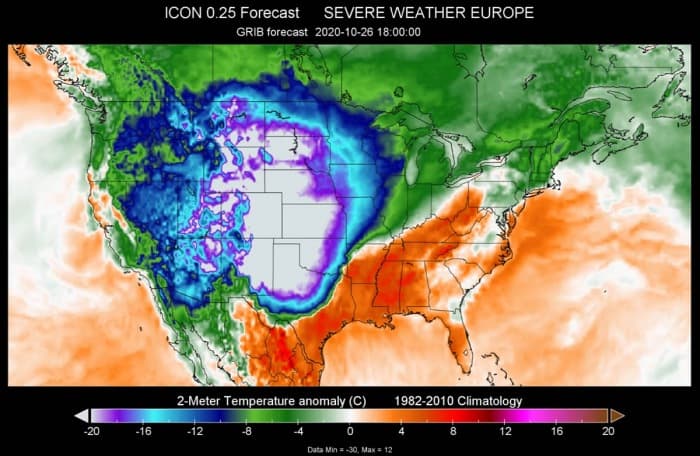 Anomalies de températures au sol prévues sur l'Amérique du nord en journée du 26 Octobre - Modèle ICON via Severe Weather Europe