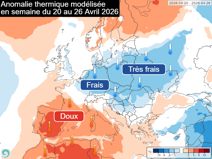 Ces derniers jours, de nombreux scénarios envisageaient la mise en place d'un puissant anticyclone scandinave pour la semaine du lundi 20 au dimanche 26 avril 2026, lequel amènerait un flux continental vecteur d'une masse d'air sensiblement plus frais. On identifiait alors un éventuel risque de gel associé. Cependant, les plus récentes modélisations ont reculé cette anomalie fraîche sur le centre de l'Europe, laquelle ne déborderait sur les régions frontalières du nord-est de la France tandis que la douceur persisterait au sud et que l'on parlerait de chaleur en Espagne.