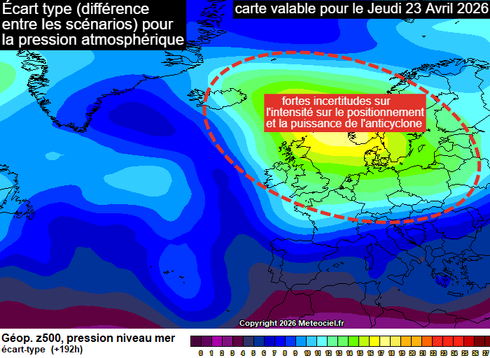 Écart-type (différences entre les scénarios) pour la pression atmosphérique le jeudi 23 avril 2026 - meteociel.fr