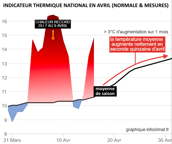 Comme l'illustre la courbe noire du graphique ci-dessous, le mois d'avril est l'un des mois au cours duquel la température moyenne augmente le plus en France. On part d'un indicateur thermique autour de 10°C au début du mois qui grimpe à plus de 13°C en fin de mois. Observer une fin avril plus froide que le début du mois n'est donc pas chose aisée. Malgré tout, l'ampleur du pic de chaleur observé du 7 au 9 avril 2026 rend cette donne parfaitement possible. Si les températures sont de saison en fin de mois, alors nous serons plusieurs degrés sous les valeurs enregistrées en fin de première décade.