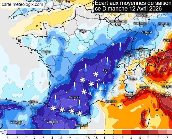 Écart des températures aux moyennes de saison ce dimanche 12 avril 2026 - meteologix.com