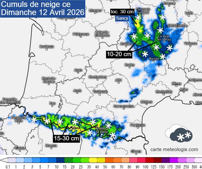 Cumuls de neige prévus ce dimanche 12 avril 2026 - meteologix.com