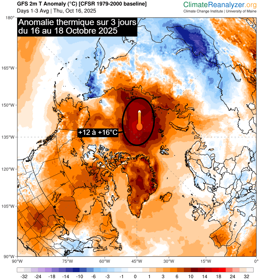 Cette anomalie douce n'est pas terminée, bien au contraire. Sur la période de 72 heures allant du jeudi 16 au samedi 18 octobre 2025, les températures moyennes se situent souvent 12 à 16°C au dessus des normales saisonnières dans les régions situées près du pôle ! Plus globalement, ce sont l'ensemble des zones situées aux latitudes polaires qui enregistrent une importante anomalie douce. On constate que le Groenland enregistre des températures 6 à 10°C au dessus de la normale.