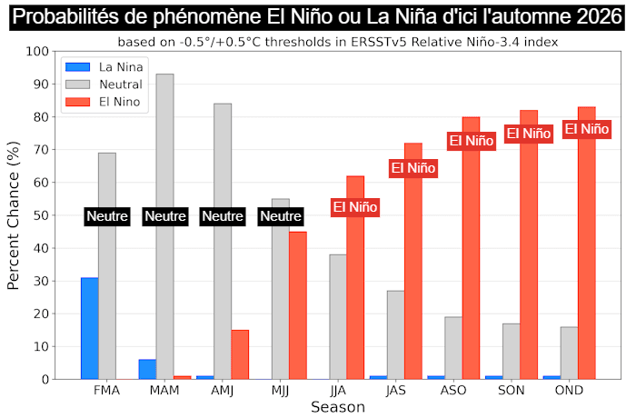 Ce qui rend le record actuel remarquable c'est qu'il se produit hors période d'El Niño, ce phénomène qui réchauffe les eaux de surface dans l'est du Pacifique équatorial et qui s'accompagne d'une hausse de la température moyenne mondiale. En effet, l'année record pour la température moyenne des mers et océans fut 2024, dernière année sous l'effet d'El Niño. Il est donc remarquable d'atteindre les niveaux de 2024 alors que nous sommes actuellement en phase neutre. D'ailleurs, la donne devrait s'inverser avec le probable retour d'El Niño d'ici cet été 2026. Les prévisions misent sur une probabilité de plus de 80% d'ici à l'automne prochain.