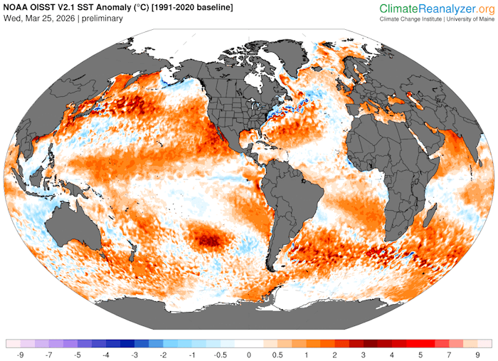 Anomalie de la température de l'eau en surface sur Terre au mercredi 25 mars 2026 - climatereanalyzer.org