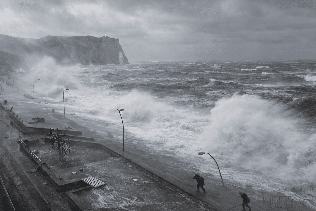 Simulation de la plage d'Étretat lors de la haute marée au pire moment de la tempête Goretti avec des vents aux alentours de 130 à 150 km heures en rafales.