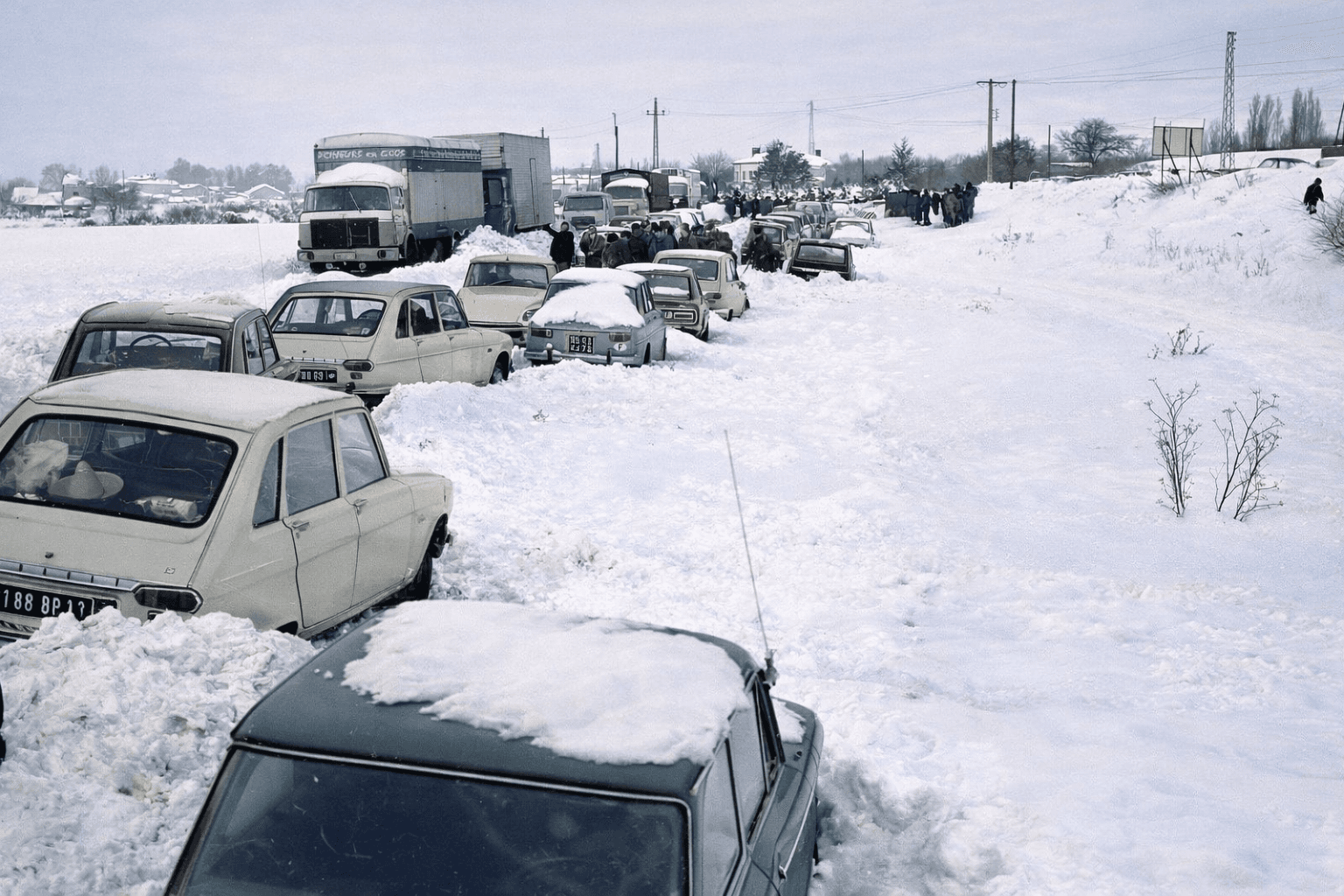 L'autoroute A7 transformée en cimetière à véhicules abandonnés le 31 décembre 1970 - NOTA : cette photo a été légèrement restaurée car l’originale était de trop mauvaise qualité - meteo-paris.com