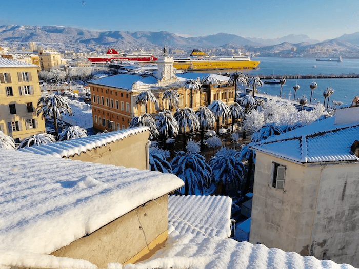 Un premier épisode neigeux concerne l’extrême Sud-Est entre le 26 et le 27 février, lié à une instabilité débordant d’Italie. La neige tombe jusqu’en plaine et même sur le littoral entre le Var, les Alpes-Maritimes et l’est des Bouches-du-Rhône. Elle atteint Nice, Menton et surtout Ajaccio, qui se réveille le 27 février sous 15 cm de neige.