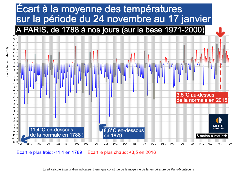 En considérant la période la plus froide, s’étendant du 24 novembre au 17 janvier, celle-ci est de loin la plus froide jusqu'à nos jours. Durant cette période du 24 novembre 1788 au 17 janvier 1789 (1 mois et trois semaines), la température aurait été de 11,4°C en-dessous de la moyenne 1971-2000 !!! Inimaginable de nos jours !