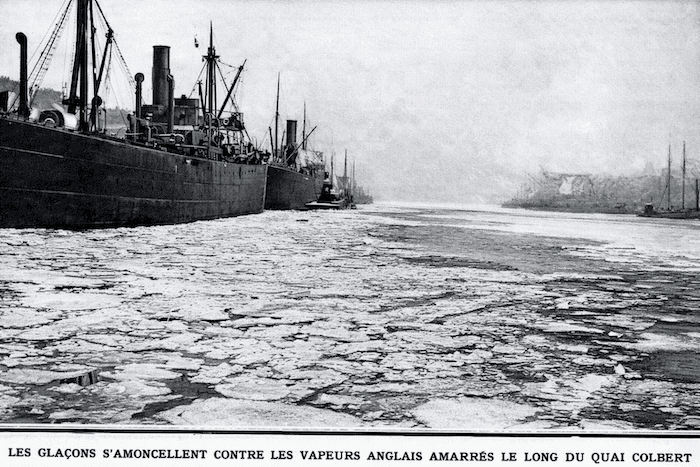 Les rivières de l’Est commencent à geler le 24 janvier, tandis que celles du Nord, y compris celles de la région parisienne, le sont dans les derniers jours de janvier, un phénomène inédit depuis 1895. La navigation devient impossible sur les canaux puis sur la Seine.  Parallèlement, la forte demande en charbon engendre d’importantes difficultés d’approvisionnement à Paris, comme à Londres. Malgré l’utilisation de quelques brise-glace et la construction de barrages pour retenir les glaces près de Rouen, les péniches restent bloquées entre Rouen et Paris.  Un service spécial de transports automobiles est alors mis en place.
