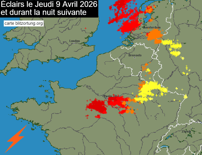 Éclairs détectés le jeudi 9 avril 2026 et la nuit suivante - carte blitzortung.org