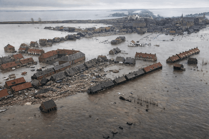 Alors que certaines maisons sont noyées jusqu'au toit, certains bâtiments s'effondrent carrément et emportent leurs habitants. Près d'un sixième du territoire néerlandais est touché par les inondations, ce qui donne une idée de l'ampleur du phénomène de surcôte ! On comptabilise aussi 19 décès en Écosse, 28 en Belgique et pas moins de 307 en Angleterre ! À cet horrible bilan humain, il faut ajouter le décès d'environ 30.000 animaux noyés dans la catastrophe !
