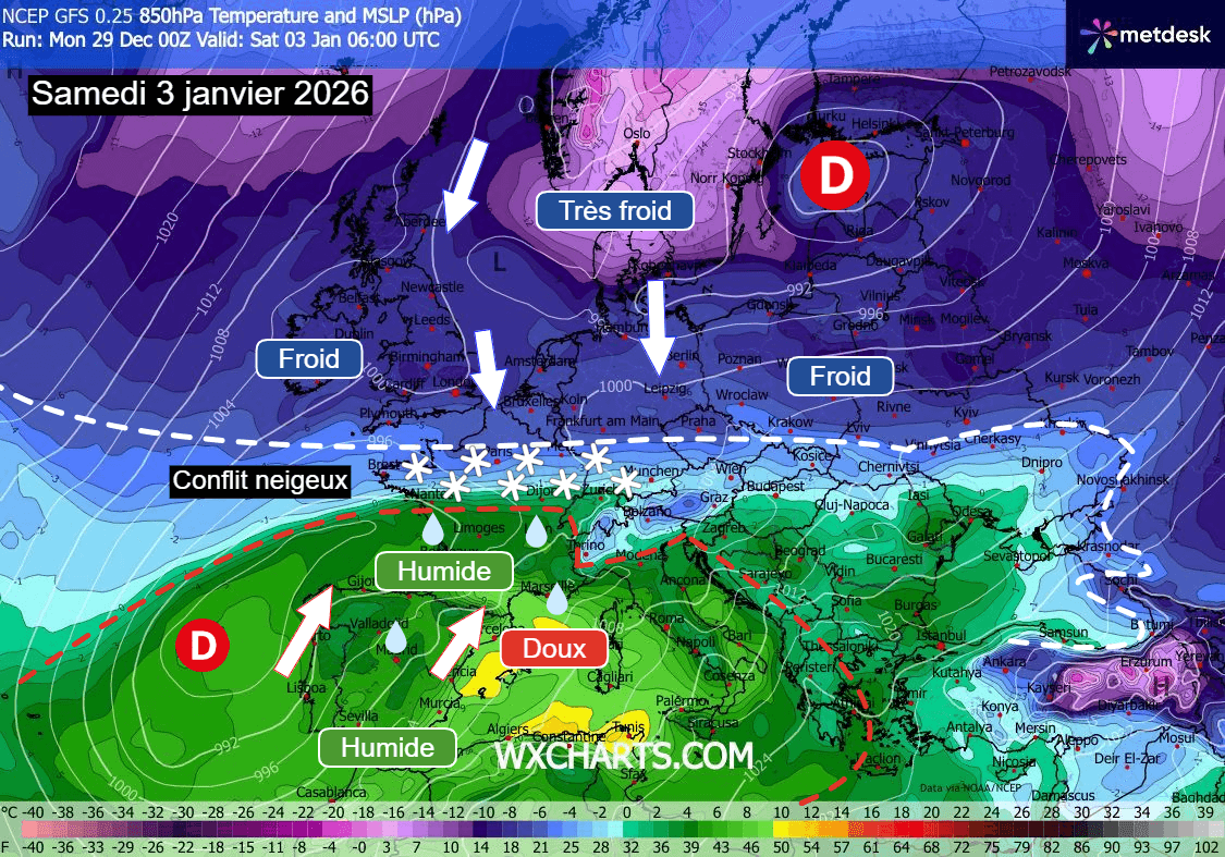 Or, de l'air froid, lié cette fois-ci à la vaste zone dépressionnaire scandinave, débordera également vers la France dans le même laps de temps, permettant ainsi la mise en place d'un conflit de masse d'air marqué sur notre pays. Ce conflit entre air sec mais froid débordant du nord et air plus doux mais aussi bien plus humide remontant du sud pourrait favoriser la survenue d'un épisode neigeux potentiellement notable quelque part sur la France.
