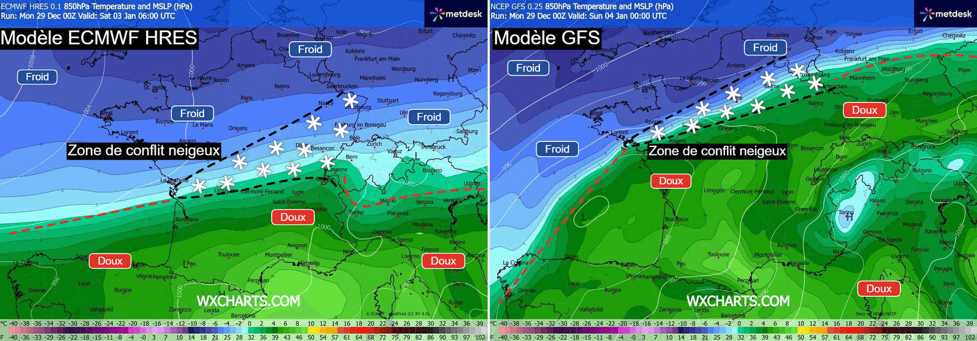 En effet, les principaux modèles de prévisions ne sont pas encore tous en accord sur la localisation exacte de cette zone de conflit entre air froid et air doux mais également sur son intensité. Certains modèles voient en effet un air doux s'étendre très au nord, favorisant ainsi les régions du nord et du nord-ouest, tandis que ces régions conserveraient un air plus sec et froid sur d'autres modélisations avec un conflit neigeux s'effectuant plus au sud.