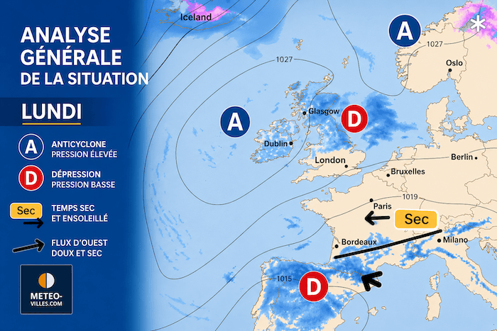 Pour ce lundi, la situation météorologique à l’échelle européenne est dominée par un anticyclone solide sur l’Atlantique qui étend son influence jusqu’à une bonne partie de la France. Cette zone de hautes pressions favorise un temps globalement stable et sec.