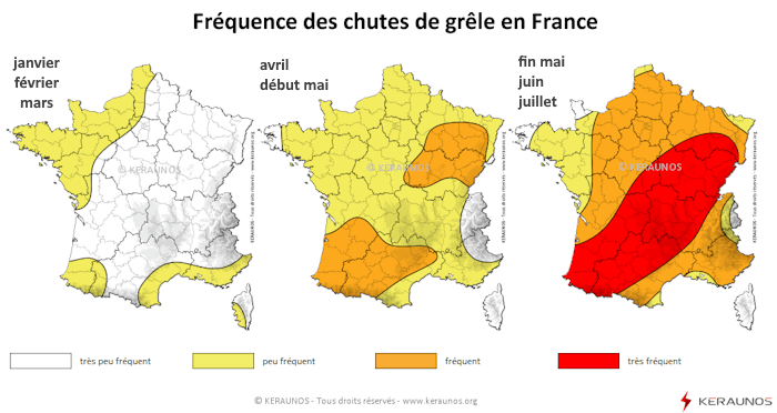 Fréquence des chutes de grêle en France entre janvier et juillet - cartes keraunos.org