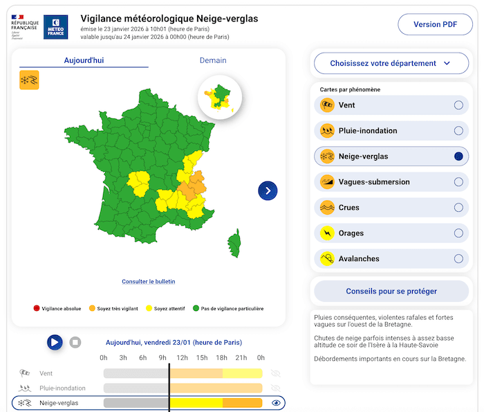 En fin d’après-midi et début de soirée, la tempête Ingrid devrait provoquer des chutes de neige importantes à relativement basse altitude dans les départements alpins. Une augmentation du niveau de vigilance pour le paramètre « neige-verglas » est envisageable pour l’Ain et la Drôme. Le passage en vigilance orange est lié à l'effet d'isothermie qui pourrait faire baisser le niveau des chutes de neige, jusqu'en plaine et sur les autoroutes fréquentées des vallées alpines avec un fort trafic en au retour du travail. Le nord Isère, ainsi que les vallées de Chambéry et notamment Annecy seront particulièrement exposées.
