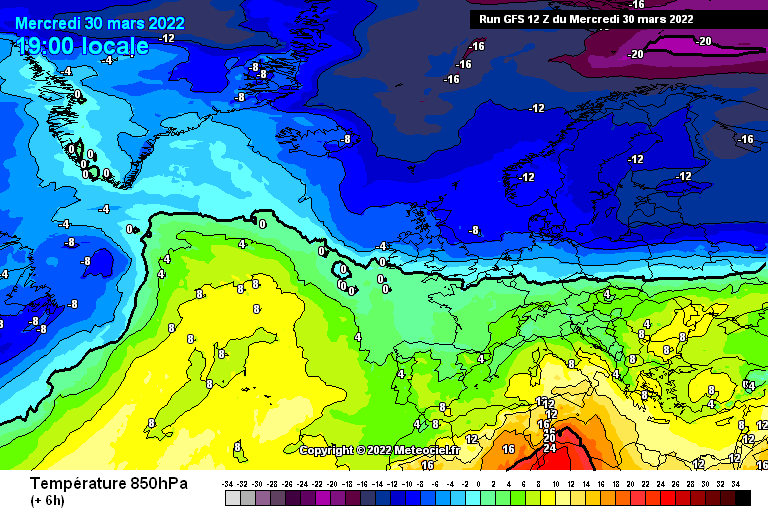 Animation des températures à 850 hPa sur l'Europe du 30 mars au 4 avril 2022 – Modèle GFS via meteociel
