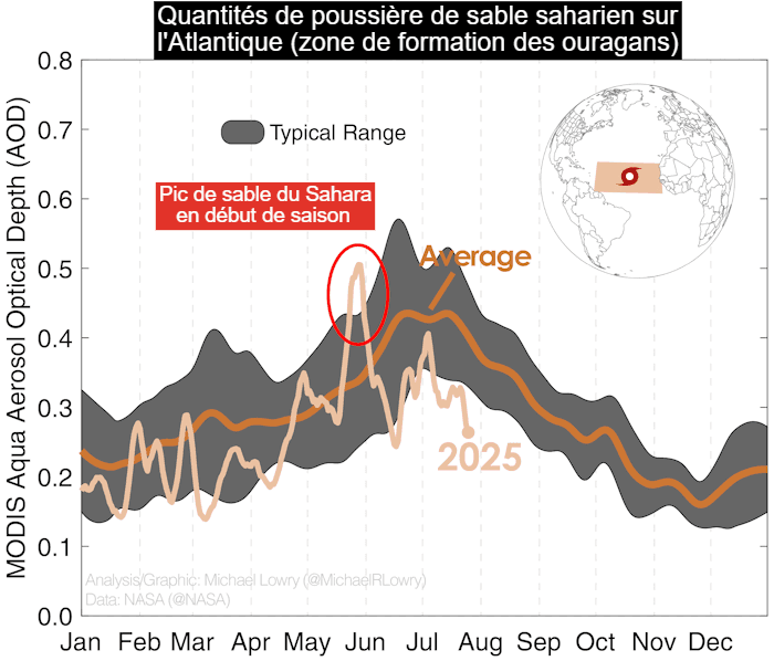 La saison avait tardé à débuter avec la première tempête tropicale (nommée Andrea) n'apparaissant que le 23 juin 2025 au milieu des eaux de l'Atlantique. À ce moment, les importantes quantités de poussières de sable venues du Sahara, qui survolaient la zone de formation des systèmes tropicaux, étaient mises en cause. En effet, les poussières du Sahara assèchent l’air et bloquent une partie du rayonnement solaire, limitant l’énergie de l’océan. Cela constitue un frein important à la naissance et/ou la force des ouragans. Toutefois, les poussières sont désormais très discrètes depuis juillet. On ne peut donc pas les blâmer pour la faible activité cyclonique des dernières semaines.