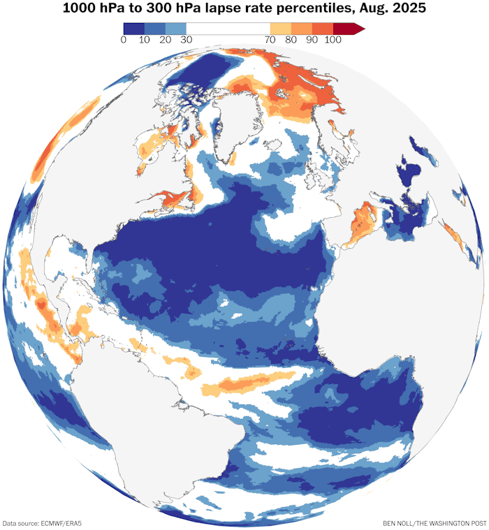 Anomalie de gradient thermique vertical sur l'Atlantique en août 2025 - via The Washington Post