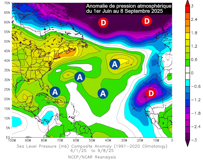 Anomalie de pression du 1er juin au 8 septembre 2025 - NOAA