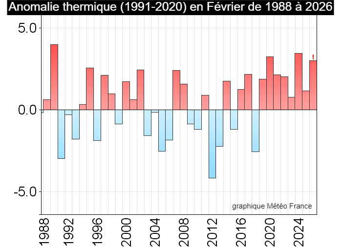 Anomalie thermique (aux normales 1991-2020) en France au mois de février de 1988 à 2026 - Météo France