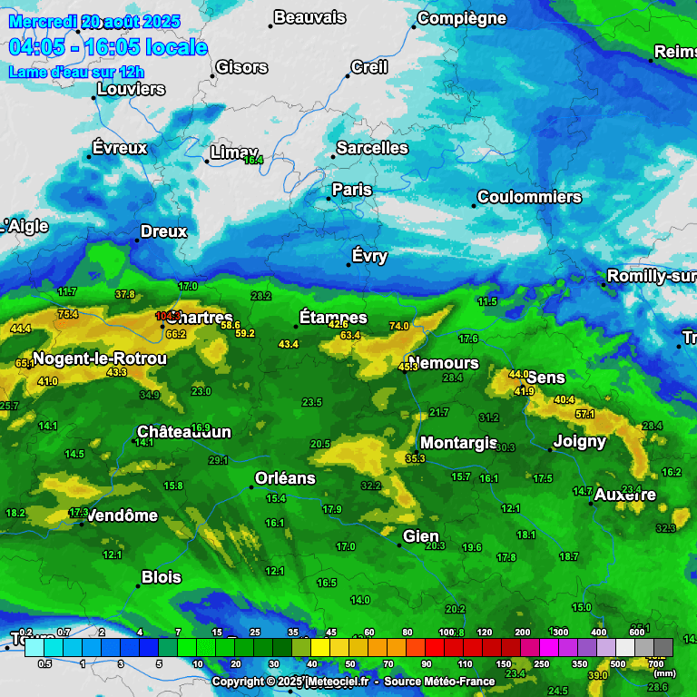 Cumul des pluies sur 12 heures le mercredi 20 août entre l'Île-de-France et le Centre - carte Meteociel