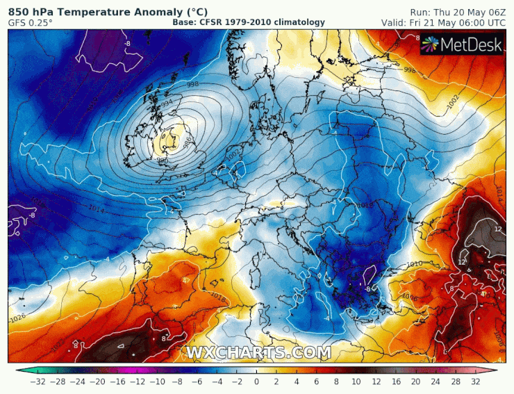 Si les prochains jours seront dominés par des températures bien trop fraîches pour la saison, c'est encore la fraîcheur qui devrait dominer au cours de la semaine prochaine. En effet, comme nous l'avons vu sur l'animation ci-dessus, l'anticyclone devrait se centrer sur le proche-Atlantique et les Îles Britanniques, si bien que le flux restera orienté au secteur nord-ouest sur la France, freinant considérablement la hausse du thermomètre.