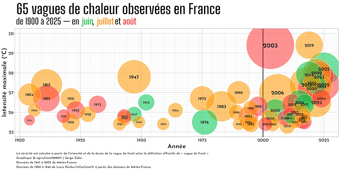 Répartition temporelle des 65 vagues de chaleur observées en France de 1900 à 2025 - via Serge Zaka