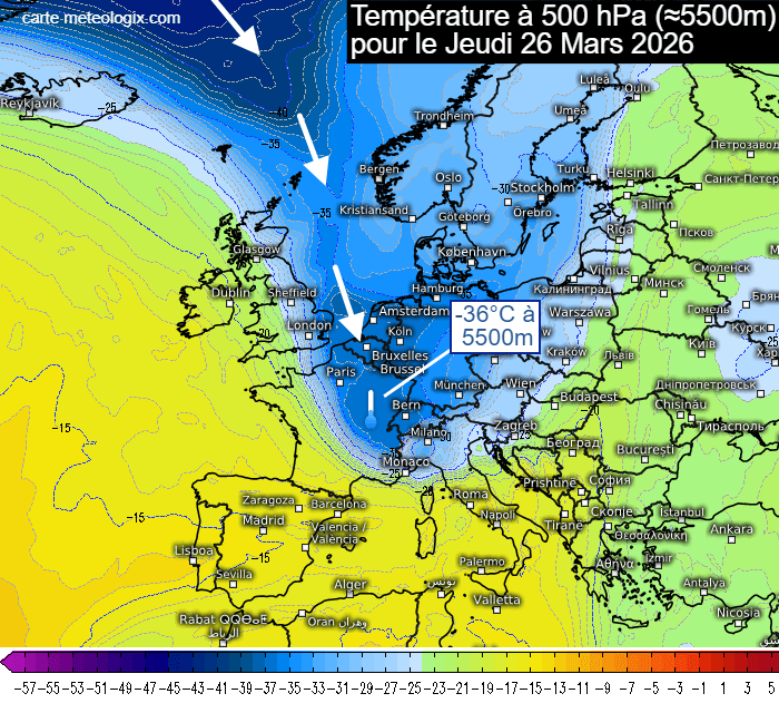 La situation des deux prochains jours sera particulièrement propice aux giboulées. En effet, la coulée d'air froid en provenance du Groenland sera marquée en altitude. Ce jeudi 26 mars 2026, la température à 500 hPa (vers 5500 mètres) affichera -36°C au dessus du nord-est de la France ! Autant dire qu'il fera très froid à l'altitude où circuleront les nuages et que le contraste avec l'air plus doux près du sol va créer un fort gradient thermique, idéal pour renforcer l'instabilité et favoriser les précipitations sous forme de giboulées.