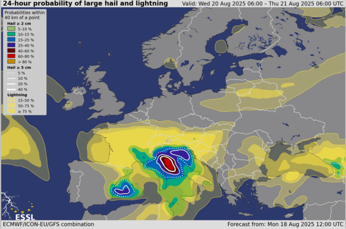 Carte du risque d'orages et de grêle pour mercredi - ECMWF