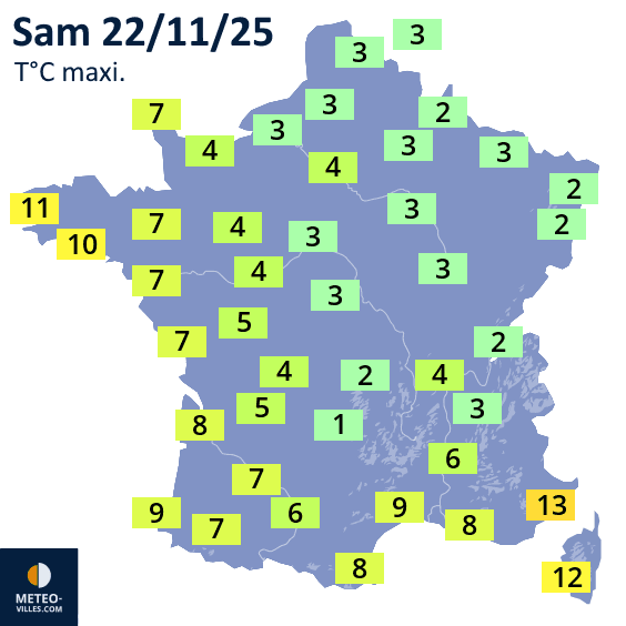 Températures maximales prévues le samedi 22 novembre 2025 - Météo Villes