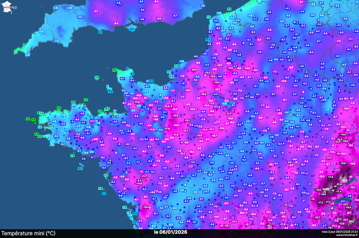 Mardi 6 janvier 2025, au matin, les les gelées étaient particulièrement forte sur toutes les régions enneigées où le ciel était dégagé, c'est-à-dire au nord d'une ligne Limoges, Orléans, Reims.